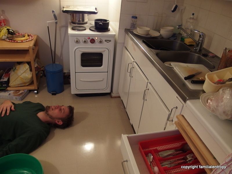 This evening when Karsten came home from work, I was busy doing three things at the same time: cooking, doing the dishes and putting away the clean ones. Karsten lay down to relax a bit. I complained that, in the whole flat, he kind of chose the worst spot he could find.