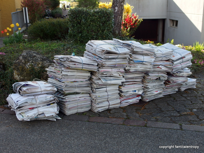 Regarding the one today, stumbling can almost be taken literally: once a month on a Saturday the used paper is being collected by the garbage disposal. So once a month, you will find meticulously piled and tied paper packs in front of the buildings. I am always in awe regarding the tidiness of these piles and I haven’t figured out how it can be done with such a precision. Always feeling slightly bad when I add mine, I used to put the paper outside when it was dark… By now, I developed a trick how to make my pile look a bit more neat, but with a trained eye you might still be able to tell which one is ours.