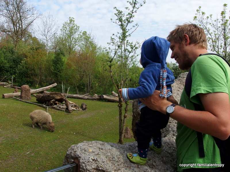 Yesterday, we used the good weather for a trip to the Zoo. We have been meaning to go there with the little one for a while now, ever since she enjoyed petting the dog of our friends so much. The Zoo in Zurich used to be rather small compared to other Zoos in big cities, but during the last years, it has undergone some big changes regarding the compounds. As many other zoos, they started to group animals according to their natural surroundings, creating different habitat foci to experience. Two of the early habitats they created are the Pantanal (South-american wetland) and the Masoala Hall, the flagship of the zoo. It’s a Madagascan rainforest on 11.000 square meters where you can walk around and, with a bit of luck, see chameleons, geckos, flying foxes, lemurs and so on. It’s one of Karsten’s favourite spots in Zurich and we bought an annual ticket as soon as we moved here. The new habitat which is going to open in June, is the Kaeng Krachan elephant park.