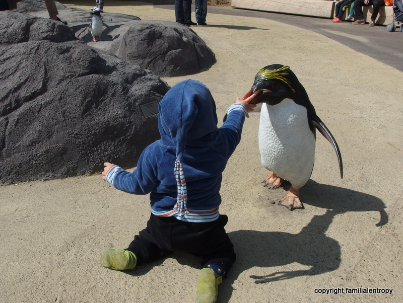 But going to the zoo with an almost 10 month old young baby means visiting the zoo with a slightly different perspective. We leave out most of the big animals and focus on a few other instead (the annual ticket really pays off now!). We stopped immediately right behind the entrance gate where a rocky area with life-size penguins was constructed last year – absolutely perfect for someone who is about the size of a Humboldt penguin! We spent a lot of time there, the little one was happy and distributed kisses, especially to the blue penguin.