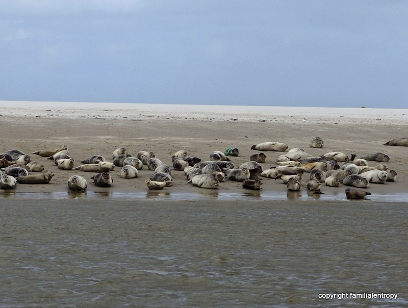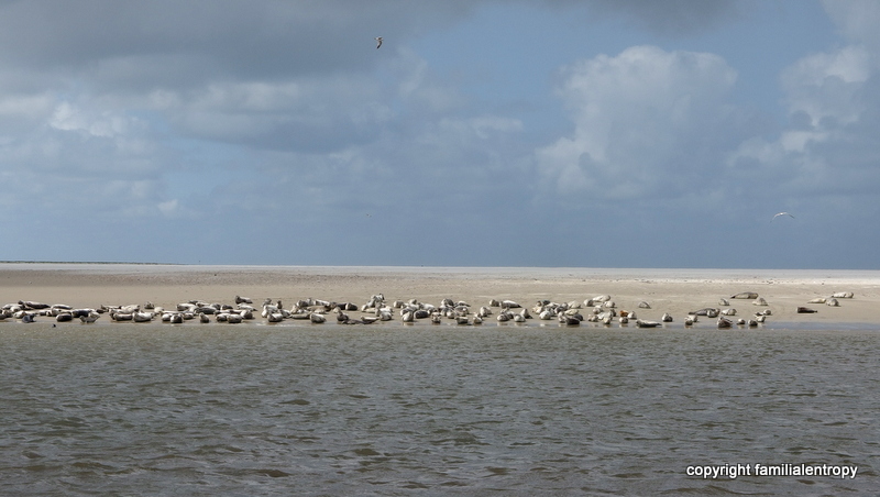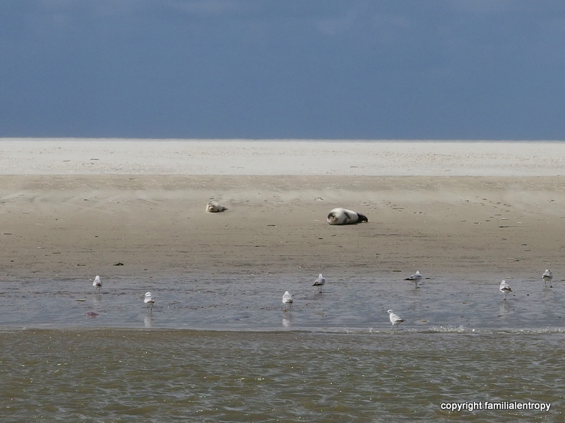 I love being on boats and when we left the little harbour, the wind freshened and the sun was sparkling on the water – so beautiful. It was a small shrimp boat which is not fishing anymore (unfortunately, it doesn’t pay off anymore since the coastal areas are all overfished) but showing tourists the seal banks near Spiekeroog. As there were many children on board, the captain did a little fishing anyway and put the catch in a waterbox so everyone could see (and sometimes touch) it. Although the area is overfished I was amazed by the diversity in the net!