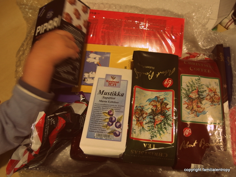 So much good stuff! Christmas tea! Christmas coffee (with cinnamon and cardamom). Ginger bread. Little christmas figures. Christmas chocolate. Blueberry tea. Finnish jam. And and and…..