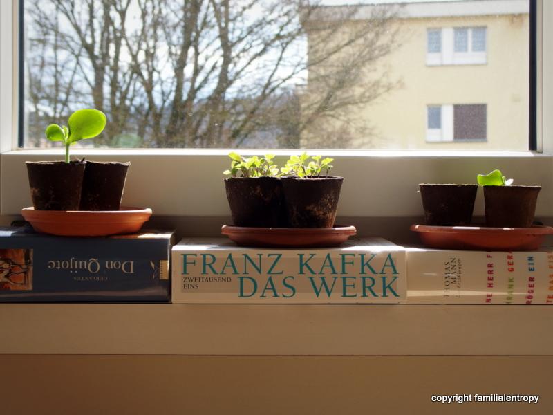 Spring automatically means getting rid of a lot of weed, clearing the flower beds and starting to grow seedlings on the window bench. Which always confronts me with the problem that we actually don’t have proper window benches. But in a household full of books there will always be a solution how to provide seedlings with enough sunshine…..