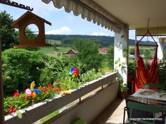 Special treats are the cherries, the woodland strawberries, tomatos and a Peruvian ground cherry (though I am not sure whether it will grow big enough to have any berries this year). And of course the new hanging seat that Karsten got for his birthday – such a great and relaxing thing to have on a balcony!!! Only the blueberries, one of Karsten’s most wanted plants for the balcony, are turning out to be a slight dissappointment…so far we counted maybe ten berries. 🙂