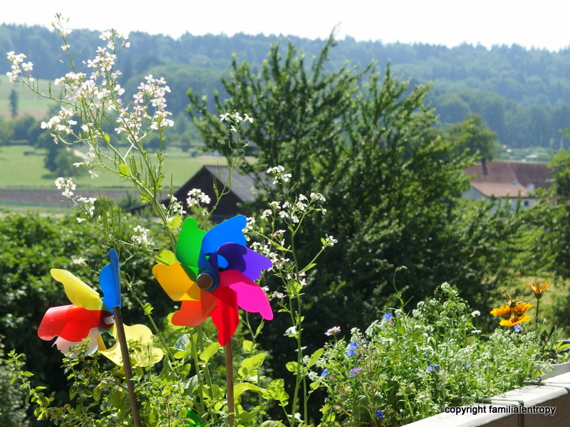 Special treats are the cherries, the woodland strawberries, tomatos and a Peruvian ground cherry (though I am not sure whether it will grow big enough to have any berries this year). And of course the new hanging seat that Karsten got for his birthday – such a great and relaxing thing to have on a balcony!!! Only the blueberries, one of Karsten’s most wanted plants for the balcony, are turning out to be a slight dissappointment…so far we counted maybe ten berries. 🙂