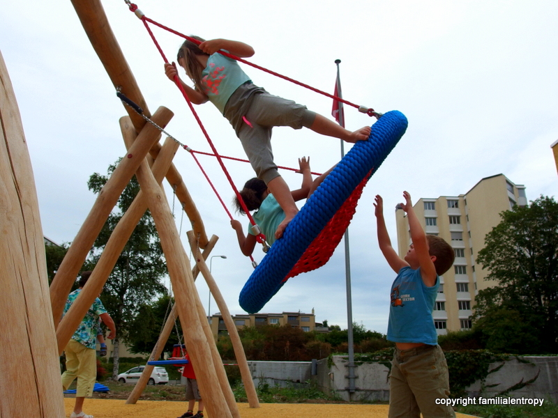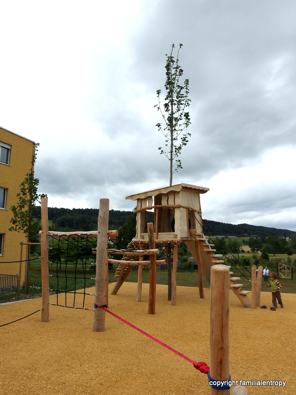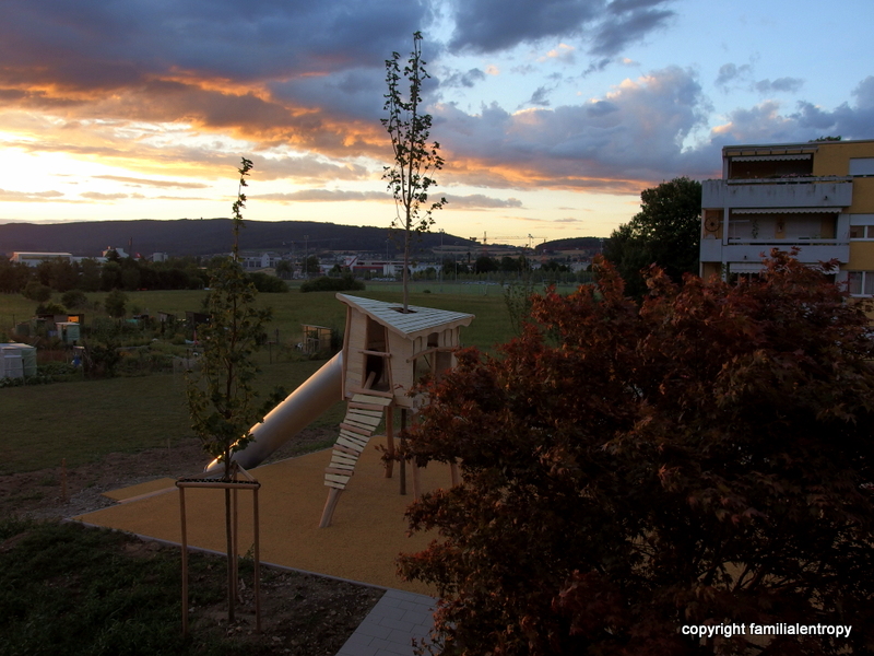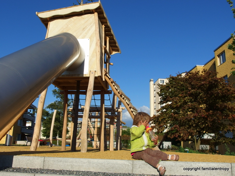 And after months and months of discussions and numerous complaints from all sides, everyone seems surprisingly happy with the new playground. And why shouldn’t we! It’s the best playground in the whole village and it’s right in front of our door. Even the fear that there wouldn’t be enough options for the very little ones didn’t become true: the climbing frames are perfectly fine for little children, the sandbox has finally been ground off so that we hopefully don’t risk any deep-down-to-the-bone-lacerations and despite the worries that the tree house with the including slide might be too dangerous and steep it took the little one only one week to climb and slide all by herself (with me watching anxiously from the ground). The only real disadvantages is the lack of shadow which was, however, foreseeable. What do you expect if you replace big trees with small ones (sigh….). But thanks to the cooler temperatures we are no longer restricted to play times before 10am and after 6pm but can climb and swing and slide all day long.