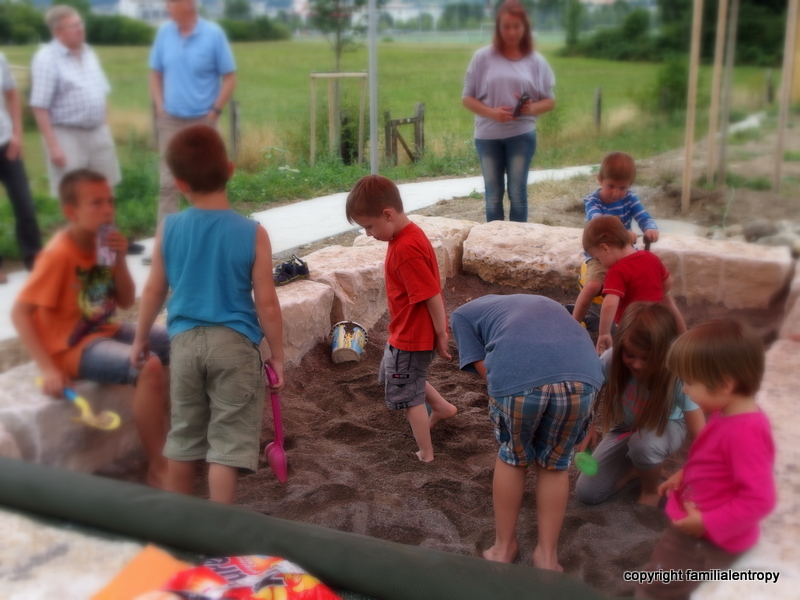 After months and months of construction work, we finally reached one of the milestones: the new playground is ready and open for children. (Well, grass and flowers still need to be newly planted and the sandbox doesn’t contain sand but gravel instead but hey – the children started to play “gravel quarry” so it’s fine for them!).
