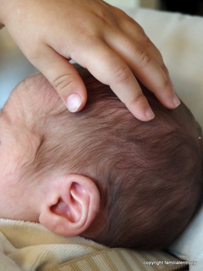 And the little one? So far, she is absolutely thrilled about her brother. She pets him and talks to him and looks after him (with me looking after her…) and is, as far as I can tell, quite happy to be a big sister. It is really heartwarming!! Let’s see how it’ll work out once it is just me, her and him at home (I try to ignore that this day will come sooner rather than later. So far, I am not sure how I am supposed to handle a newborn with unforeseeable feeding times and a sometimes rather froward little one at the same time. But I am sure it’ll work out somehow. Others have done it as well, right?). And gee, with a newborn on the lap, the little one suddenly appears to be so grown-up and big – she must have grown at least 5 cm during the three days I was away!