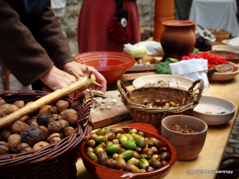 With my parents staying at our place for a couple of days, we finally managed to visit the castle which is, as we were often told before, an awesome place for children. Yesterday, however, we didn’t even visit the actual castle but the medieval market which took place in and around the inner bailey. How lucky we were! I do love medieval markets and the medieval christmas market in Dresden is one of my favorite markets during the christmas time. This medieval market yesterday was even better as there were plenty of activities for children. While many medieval markets include mainly food stalls, mead and handicrafts, this one had so many great things for children to try out and to make that I actually regretted not being a child myself. Making bees-wax candles, making ropes, sword fights, making juice, roasting nuts, making wooden buttons, carving stones, pottering, writing with quills, sealing and and and….the little one was still a bit young for most of the activities, but she was happy as long as she could pet one of the chickens. In the meantime, the hobbit was sleeping and sleeping and sleeping on his first proper outing. And the window recess in the great hall with a lovely view over the surrounding landscape proved to be a superb spot for the first outdoor-feeding…).