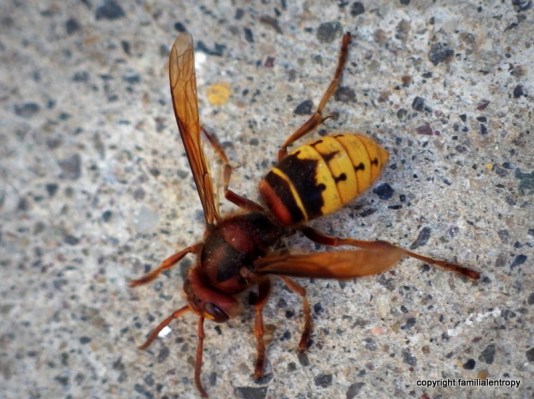 We also had a lot of hornet sightings this year. Which means we saw the same hornet over and over again, flying onto our balcony, vanishing into the small gap above the window and reappearing again after a while. We could hear it munch away on the yellow polyurethane foam. Perhaps that’s why they were all dying down at your door… too much polyurethane from this one misguided fellow…