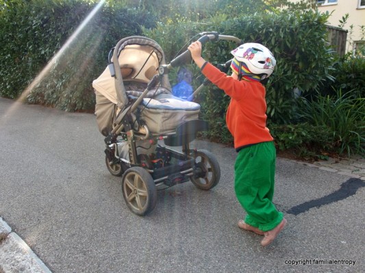 Managing the day with two children at home didn’t turn out as disastrous as expected. While I somehow didn’t find the time to shower and get dressed until lunchtime when the little one was born, I am now up and ready in the morning and wonder how I couldn’t manage it two years ago. Breakfast? No problem, I can do it one-handed while breastfeeding a baby and entertaining a two-year-old. Masters of multitasking, that’s what mothers are! Still, being somewhere on time is something that’s just not very likely right now and if we manage it, it includes a lot of organisational planning and cooperation from all three sides.