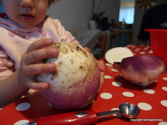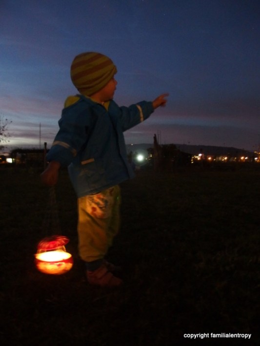 In Switzerland, the farmers bring in the last harvest from the fields at the beginning of November and in order to celebrate this occasion, children are carving beets and illuminate them with candles. In every village and town you’ll find parades with these enlightened beets, even with music and food and – as in our town – with extra-dark streets. While I know a similar tradition from Germany (we used to celebrate the 11th of November as St. Martins day and made lanterns in order to join a parade and then go from door to door to sing songs), the so-called Räbeliechtli was new to me. But one of the great things about having children is that you can completely engage in these traditions again. So, on said evening the little one was already in her pyjamas, covered with a warm jacket and a scarf and put in her buggy in order to watch the parade. She was completely thrilled, especially since we met a family from her playgroup and they gave her one of their carved beets (Räbe!). That evening, when brushing her teeth, she cheered and said:“Mom, I am happy!”. That goes right to my heart, that sentence….