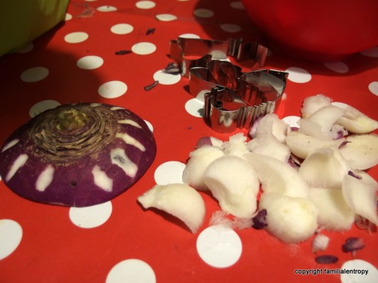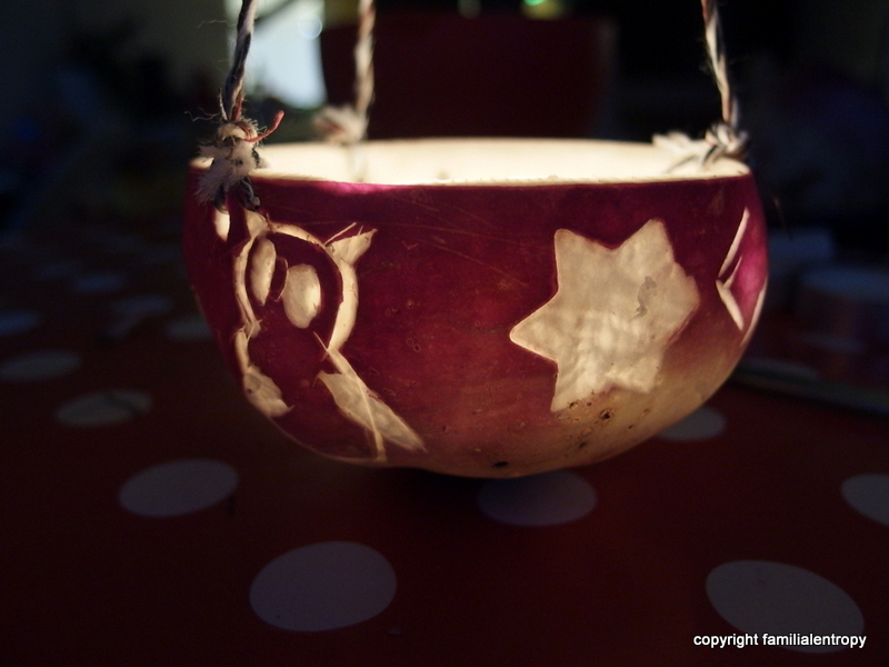 And here is how it is done: first you cut off the upper 1/3 of the beet as a lid. Then you hollow out the beet and the lid (not too much though, as you don´t want the walls of the beet to break later on). And then you take a sharp knife or a cutter and you carve figures and forms from the outside, by just scraping off a millimeter or so. That way, the reddish outer part of the beet is gone and the white inner part will illuminate the figures. You can also carve forms and figures into the lid. Depending on the wishes of your child and your own artistic abilities they’ll look better or worse. You then make three holes into the beet and the lid and attach the lid to the beet with ribbon, leaving space to put the candle inside and for the lid not to burn. The ends of the ribbons are tied together and will be used as handle. And voila, there is your Räbeliechtli! (feel free to drop me a comment if you have further questions)