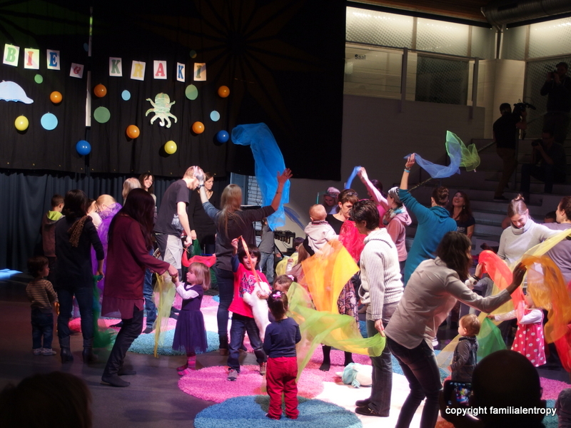 In the afternoon, we went to the other side of Zurich for a concert of her music group. Last year, she was one year old and had a little golden star on her back while I sang “twinkle, twinkle, little star”. This year, she was singing and dancing and clapping her hands. With Karsten. It was probably my one and only chance to see my husband dancing around with colored cloths and I truly enjoyed it!