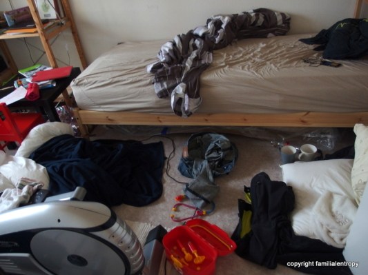 Yesterday, I started to write a blog post. It started with the words: “Every now and then I look around in our flat and while I am trying to blend out the chaos I am filled with happiness and gratitude regarding this cosy place of ours.” Then Karsten got sick and moved into our (tidy) guest room. When I entered the room this morning, it looked like this: